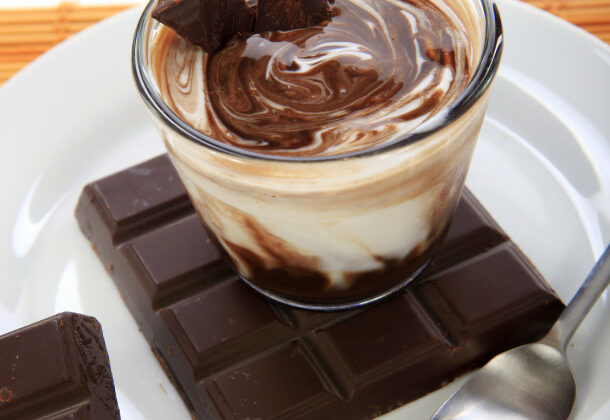 Verrines d’émincé de poires au chocolat sur crème vanille enrichie